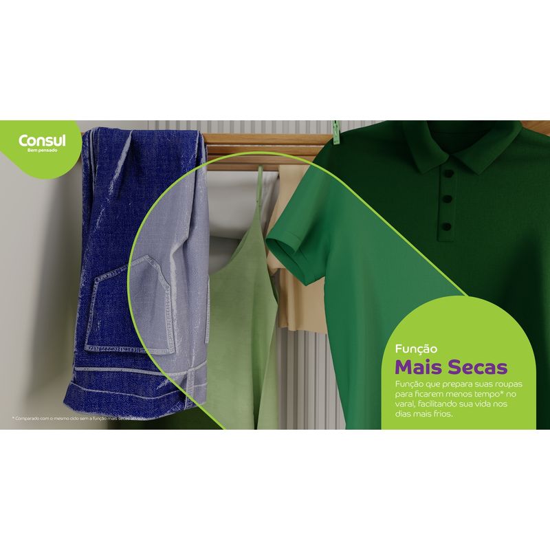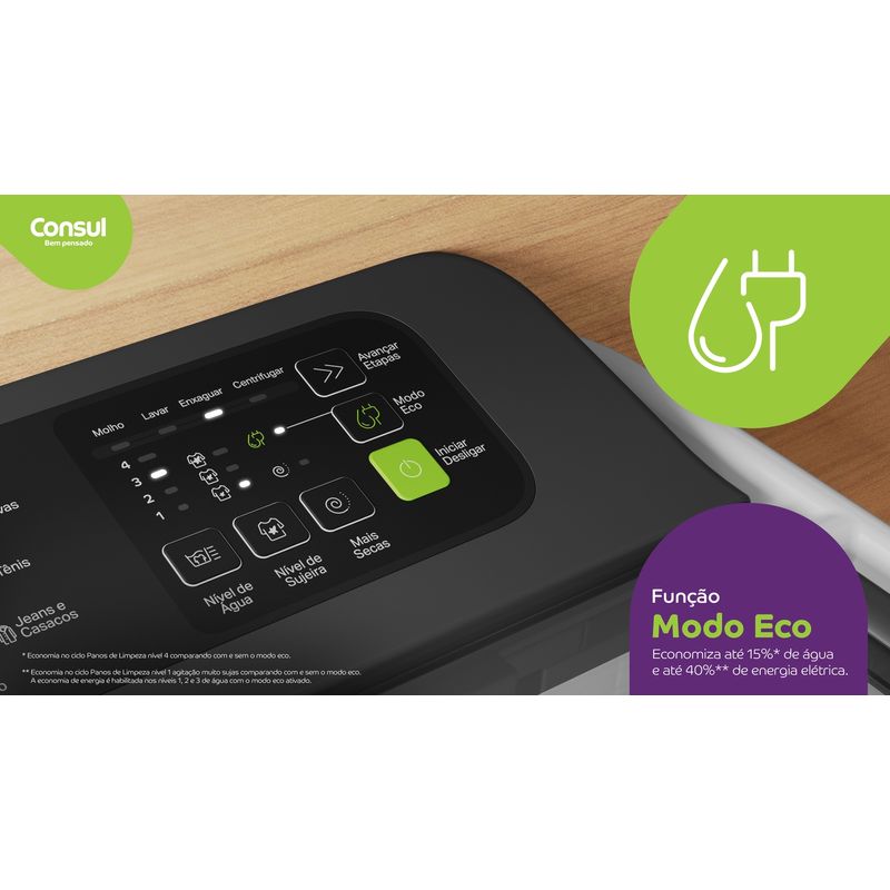 Roupa acumulada na lavanderia? Nunca mais! A Lavadora Consul 15kg chegou para dar conta da rotina de famílias grandes, lavando muito mais de uma só vez. E o melhor: ela foi pensada para não apertar sua casa, sendo a lavadora de 15kg mais compacta do mercado. Com ela, você lava até o edredom king size sem dificuldade! A economia aqui é em dobro, de verdade! Com o Modo Eco, você economiza até 40% de energia e 15% de água em cada ciclo. E na hora de usar o sabão, o copo dosador exclusivo te ajuda a acertar na medida para uma economia de até 70%. É a Consul trazendo máxima capacidade e economia para facilitar a sua vida. Bem pensado, né?