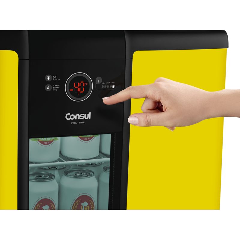 A Cervejeira Consul Amarela mantém sua cerveja sempre na temperatura ideal. Pequena por fora e grande por dentro, ela é moderna, espaçosa e possui prateleiras ajustáveis. Tem janela de vidro para você dar uma espiada sem precisar abrir a porta e painel digital para controlar os 5 níveis de temperatura. E não precisa descongelar, porque é Frost Free. Sua única tarefa será reunir os amigos!