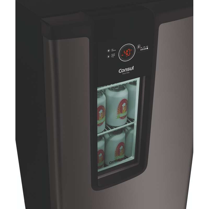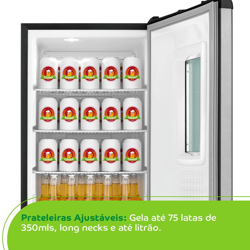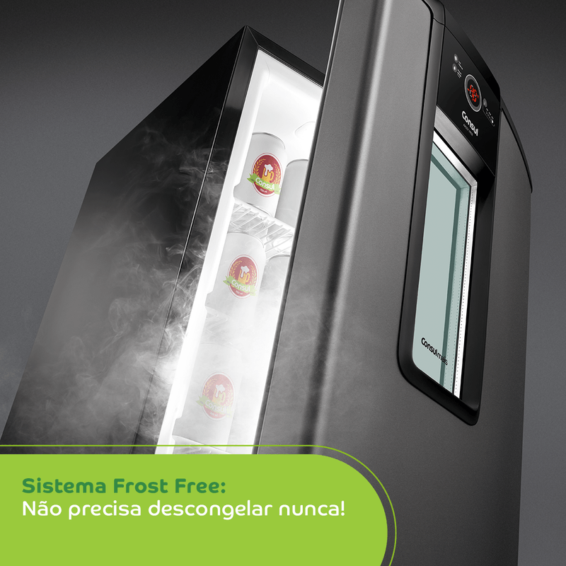 A Cervejeira Consul Mais Titanium mantém sua cerveja sempre na temperatura ideal. Pequena por fora e grande por dentro, ela é moderna, espaçosa e possui prateleiras ajustáveis. Tem janela de vidro para você dar uma espiada sem precisar abrir a porta e painel digital para controlar os 5 níveis de temperatura. E não precisa descongelar, porque é Frost Free.