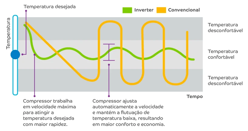 Outra vantagem da estabilização da temperatura é que o compressor vai trabalhar menos e, consequentemente, conseguirá gerar bem menos ruídos do que os outros modelos. Isso evita aquele barulho irritante durante o silêncio da noite. Se você está procurando um ar-condicionado para o quarto das crianças, por exemplo, este modelo é o ideal.