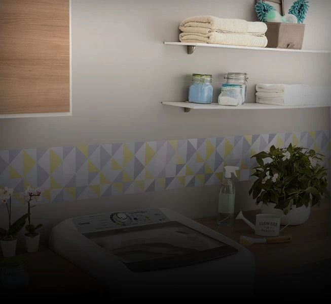 Se você tem prateleiras, separe os espaços por tipos de produtos de limpeza e deixe com fácil acesso aqueles mais usados na máquina de lavar para que você tenha agilidade na hora de lavar roupas e consiga manter a organização da área de serviço.