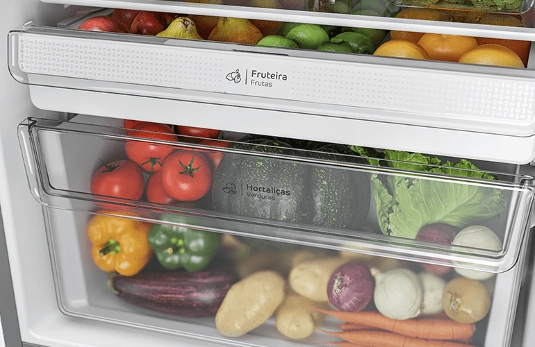 Além disso, o refrigerador Consul conta também com uma gaveta exclusiva para guardar as hortaliças separadas das frutas. Dessa maneira nenhuma fruta será esquecida ou amassada no fundo da gaveta.