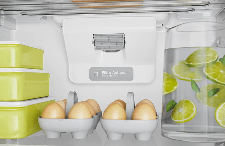 A Geladeira Frost Free com Espaço Flex conta também com filtro antiodor, capaz de absorver qualquer odor que possa ser passado para outros alimentos. Assim, você e sua família não correm o risco de beber água com gosto de geladeira.