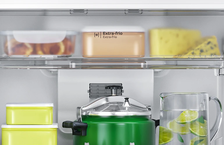 Além disso, o freezer da linha de geladeiras Frost Free com Espaço Flex conta também com a Prateleira Flex, que pode ser usada em três posições: ocupando toda a profundidade do freezer, recolhida, ocupando metade do freezer e totalmente recolhida.