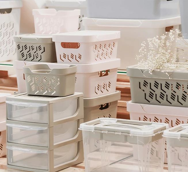 As caixas organizadoras de plástico são perfeitas para espaços como a área de serviço, a cozinha e o banheiro. Já para o quarto ou para o escritório, você pode investir em alguns outros modelos, como as de papelão ou de vime, caso combine com a sua decoração.