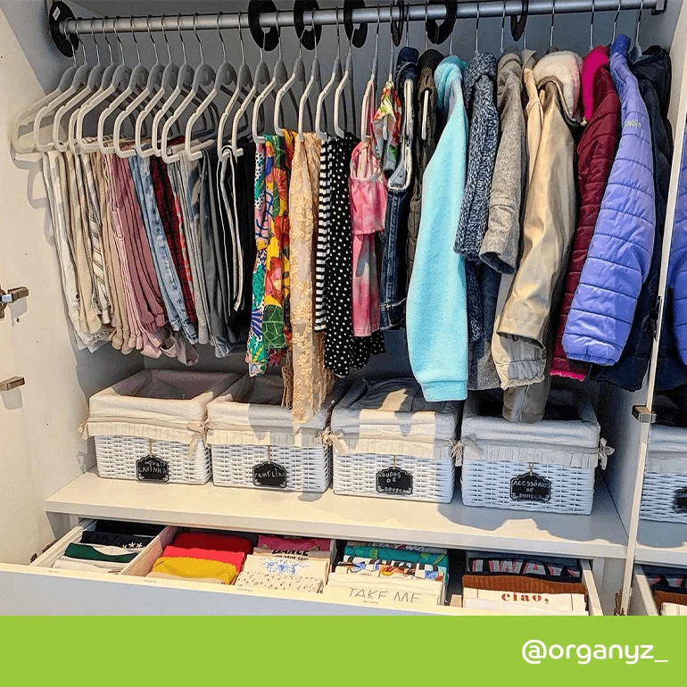 No guarda-roupa, as caixas organizadoras organizam aqueles itens que você não usa com frequência: lençóis delicados, roupas de festa ou itens íntimos que merecem um cuidado maior. Nesse caso, você pode investir em caixas de papelão ou mesmo de cestos de vime.