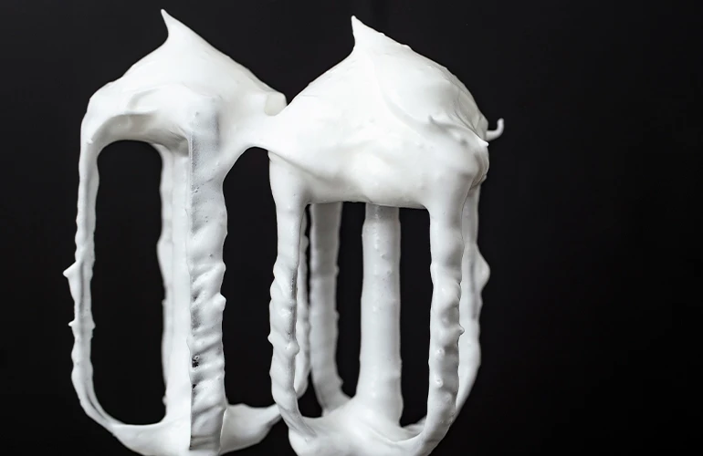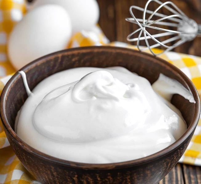 3º. Ligue a batedeira na velocidade baixa e, quando começar a formar uma espuma, aumente para a potência máxima. Bata até que a espuma fique firme e consistente.