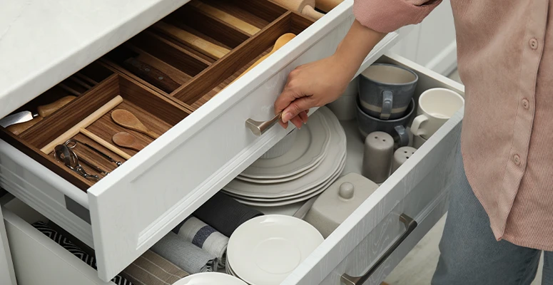 ****Gavetas******O que guardar?**Indicado para talheres, panos de prato e pequenos utensílios. Use separadores de gavetas para evitar que os itens fiquem misturados.