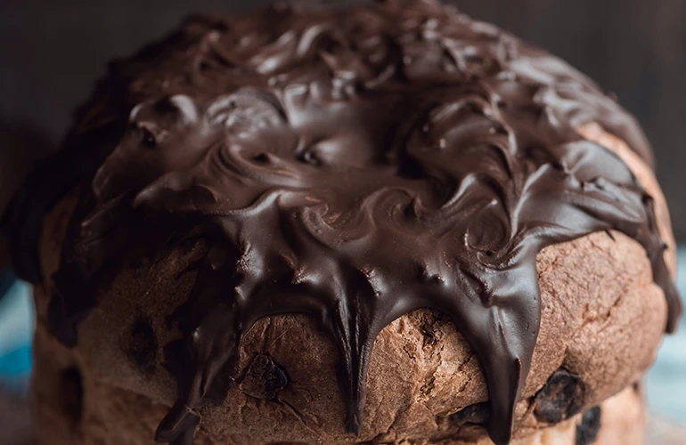 Coloque a tampa retirada do panetone e jogue por cima o chocolate derretido.