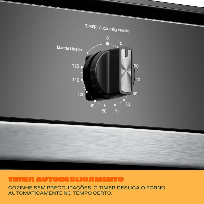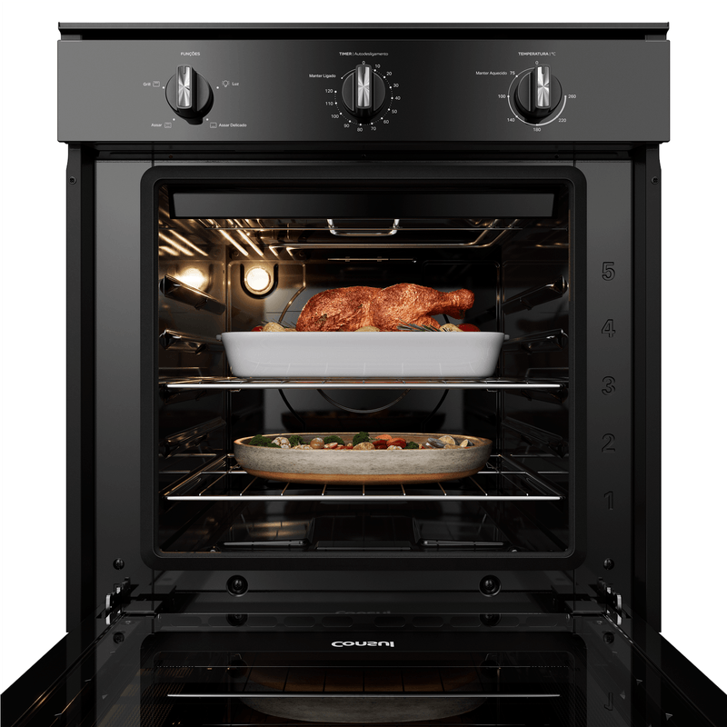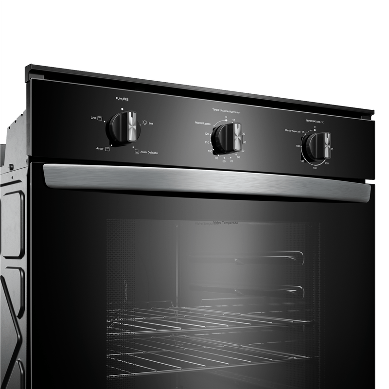 O Forno Elétrico de Embutir 84L Consul possui Timer Autodesligamento, que desliga o forno sozinho ao final do tempo programado. Seu revestimento esmaltado e liso evita o acúmulo de sujeira e gordura, é só passar um pano, e pronto! Tudo limpo. O design preto com acabamentos metálicos traz modernidade e combina com qualquer cozinha, enquanto suas 2 prateleiras com 5 alturas ajustáveis permitem assar diferentes pratos de uma vez, desde pequenos até grandes assados. Além disso, o Grill finaliza suas receitas com crocância, deixando elas irresistíveis.